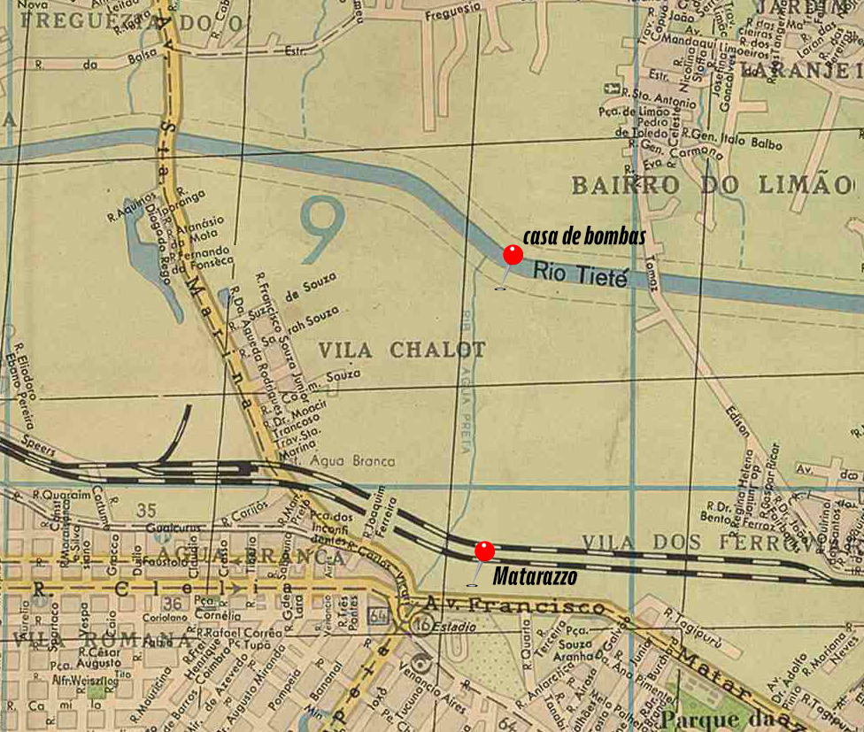 O mapa abaixo, de 1951, mostra o local onde foi construído a casa de bombas e o local onde ficava o complexo industrial: