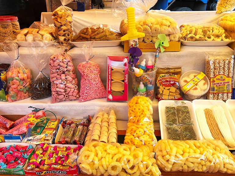 Nesta mais que diversificada barraca de doces é possível encontrar alguns que já pareciam ter desaparecido. Entre eles destaque para as mini balinhas açucaradas coloridas vendidas em embalagens que imitam mamadeiras (foto acima), canudos recheados de doce de leite e os flocos de arroz com brinquedinhos de plástico de brinde, muito comuns na década de 1980. Tem até o famoso Dipn´Lik.