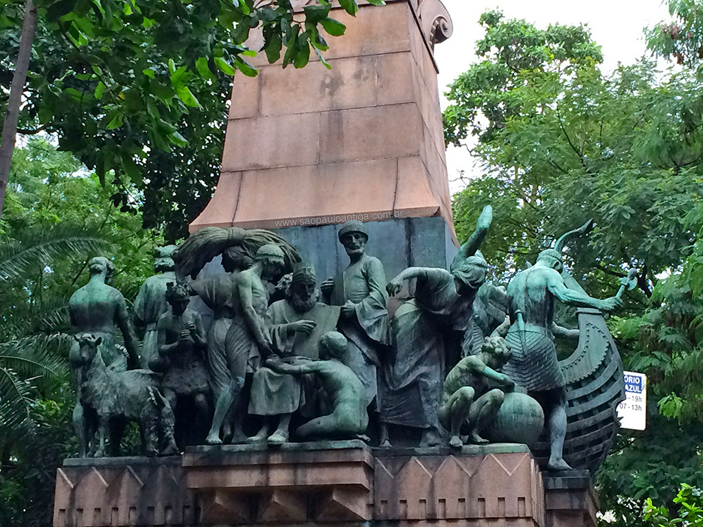 No topo do monumento há três personagens humanos: Uma mulher representando a república do Brasil, um guerreiro indígena brasileiro, e uma outra mulher, esta árabe, que está ofertando algo ao guerreiro índio.