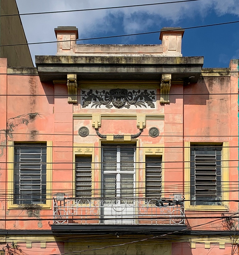 Já no andar superior as características originais estão bem preservadas. Nota-se o belo trabalho no frontão ainda preservado, o gradil na sacada e diversos outros detalhes autênticos.