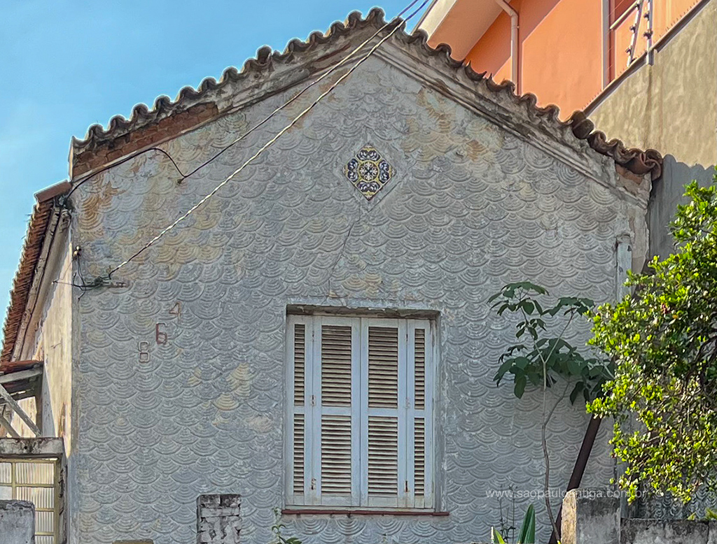 O primeiro é portão de madeira, simples e que atende a sua função que é proteger a entrada da propriedade. É possível observar que trata-se de um item original da casa, que está ai resistindo há décadas. O segundo detalhe é o azulejo da fachada, no frontão. Um item decorativo simples mas que dá um destaque no imóvel, geralmente utilizava-se um azulejo branco e fosco da Matarazzo código B4 para ser posteriormente pintado e vendido.