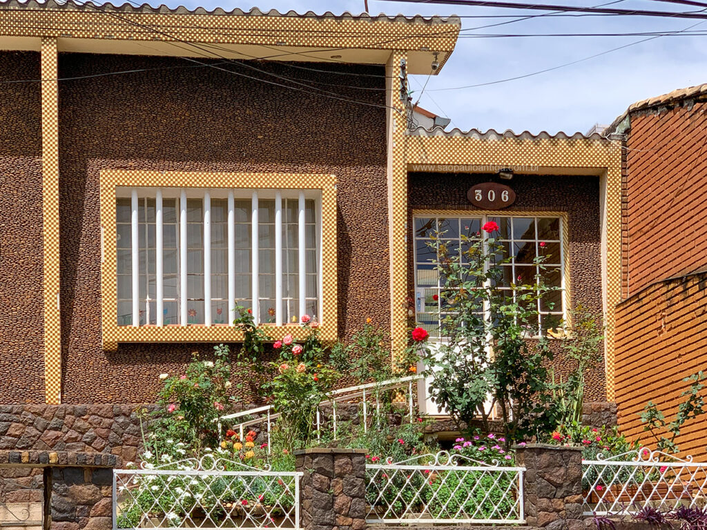 Os degraus da entrada já tiveram seu revestimento trocado em algum momento, mas ele não destoou da arquitetura. Completam a beleza da fachada as pedrinhas da parede da casa e as pastilhas amarelas e pretas que fazem a moldura das janelas e da porta de entrada. Combina-se com o jardim extremamente bem cuidado e o que temos é uma casa muito bela e muito, muito charmosa.
