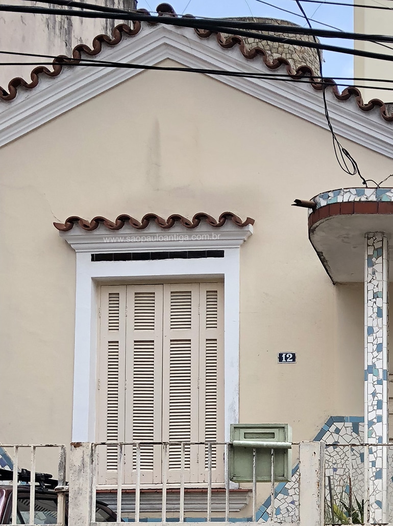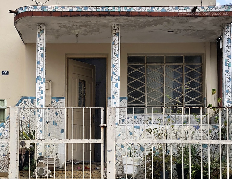 Observem que casa charmosa e interessante. Boa parte de sua fachada é adornada com caquinhos de cerâmica, sendo monocromáticos no piso e degraus e coloridos (brancos e azuis) nas paredes, mureta e colunas. Completa a fachada os detalhes simples e graciosos na janela, no vitrô da sala e também a porta de entrada que ainda é a original.