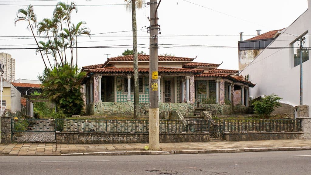 Fachada decorada com pedras de cores verdes e rosa, calçada de pedra, colunas romanas, telhado estilo oriental e em várias paredes da fachada são encontrados vários murais belíssimos de azulejos, mostrando uma construção de bastante bom gosto. O muro baixo nos remete para uma época onde a violência ainda não era tão incômoda aos paulistanos como nos dias de hoje.