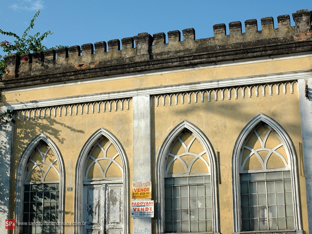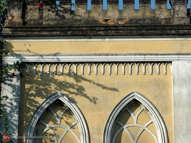 À parte o acabamento ogival, vejam a platibanda à maneira de ameias.