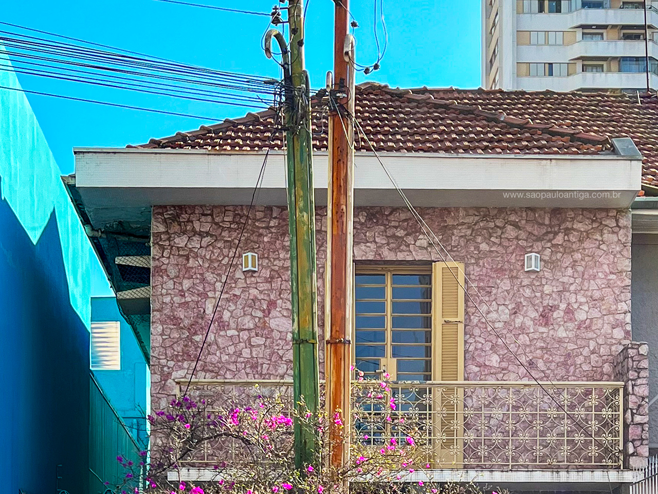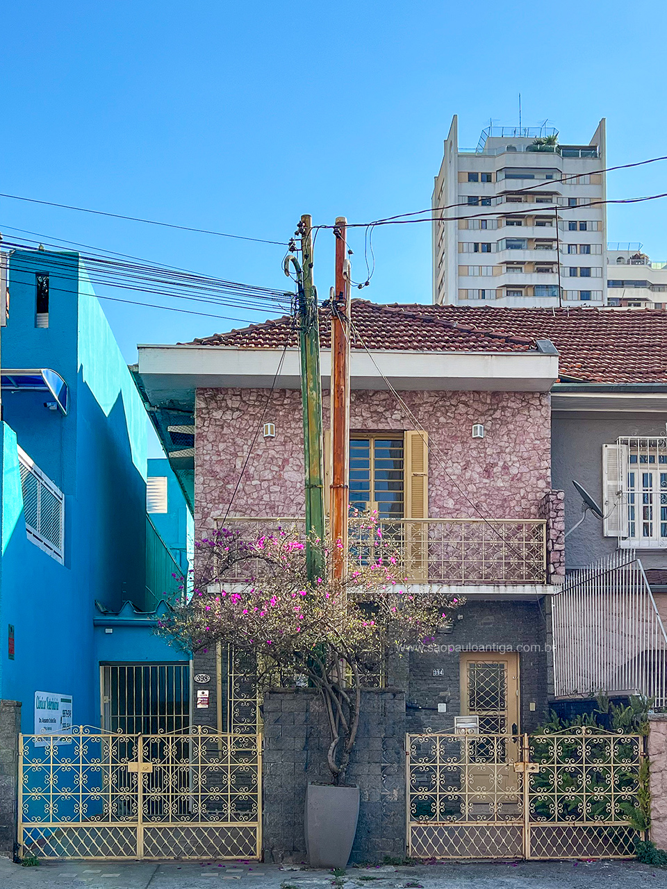 E trata-se de um conjunto gracioso e muito bem cuidado. Note que compartilham igualmente diversos materiais construtivos, como portão, gradil das janelas e piso. Outro destaque fica por conta das pedras rosas que adornam a fachada no andar superior.