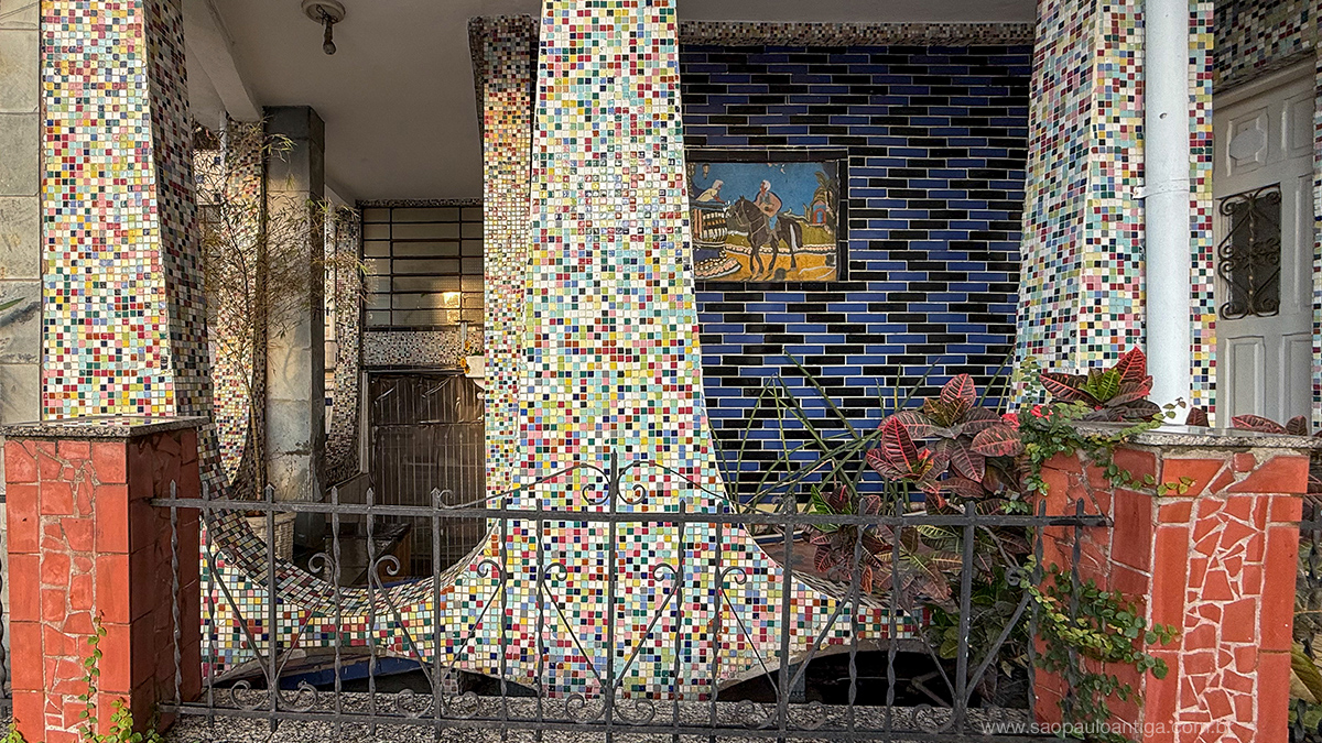 Uma casa antiga peculiar na Vila Marieta, zona leste da capital, com sua fachada de pastilhas e colunas que remetem ao Palácio do Alvorada