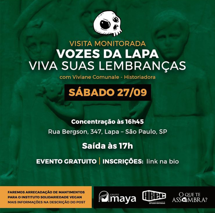 O projeto “O Que Te Assombra?”, em parceria com a historiadora e professora Viviane Comunale e com o apoio e supervisão do Grupo Maya, atual gestor do espaço, convida o público a viver uma experiência cultural única: a visita noturna “Vozes da Lapa – Viva Suas Lembranças”, no tradicional Cemitério da Lapa, também conhecido como Cemitério das Goiabeiras.