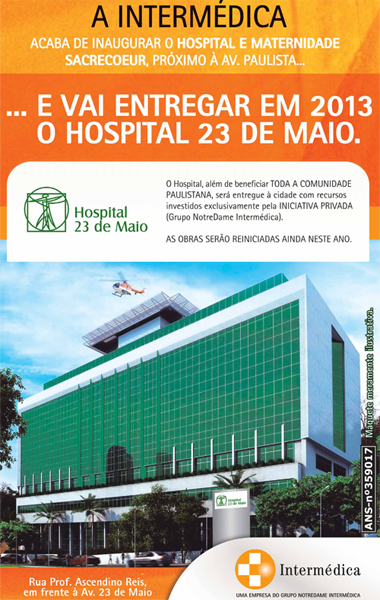 A Intermédica é a nova proprietária do edifício, rebatizado de Hospital 23 de Maio, e anunciou que as obras devem reiniciar ainda neste ano, com término planejado para 2013. É uma excelente notícia e se vier realmente a se concretizar. A empresa divulgou a seguinte propaganda nos jornais recentemente: