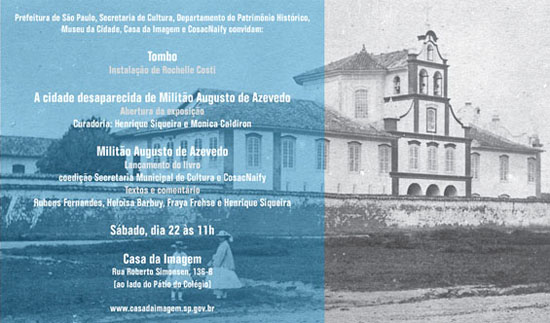 A Casa da Imagem, museu ligado à Secretaria Municipal de Cultura, inaugura no dia 22 de setembro, sábado, às 11 horas, a mostra A cidade desaparecida de Militão Augusto de Azevedo, com 80 imagens do primeiro fotógrafo que registrou a paisagem urbana paulista, e a instalação Tombo: R. Costi da artista Rochelle Costi, realizada a partir de pesquisas com material do acervo da instituição.