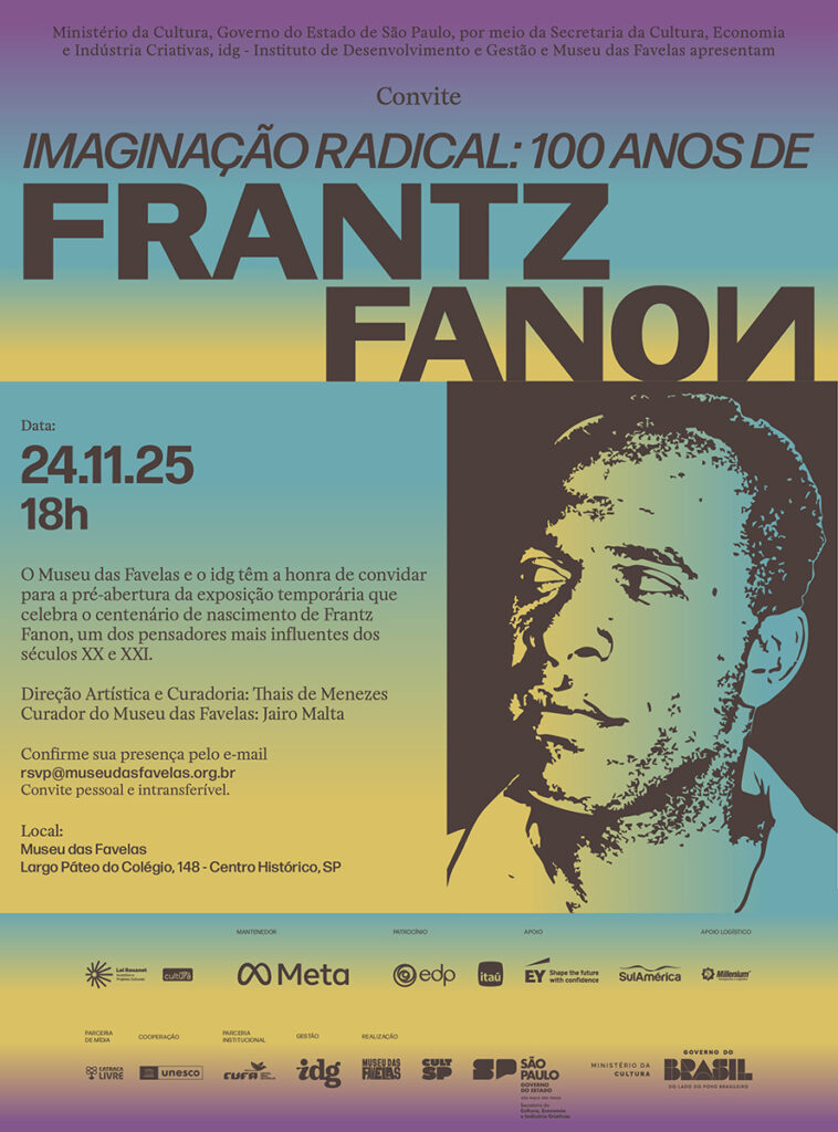 Museu das Favelas, instituição da Secretaria da Cultura, Economia e Indústria Criativas do Estado de São Paulo, sob gestão do idg – Instituto de Desenvolvimento e Gestão, já tem data marcada para a chegada da sua nova exposição.  Após o sucesso de público de ‘Racionais MC’s: O Quinto Elemento’, que saiu de cartaz no dia 28 de setembro, Imaginação Radical: 100 anos de Frantz Fanon estreia em 25 de novembro para celebrar o centenário do nascimento de um dos pensadores mais importantes do século XX. A data marca os três anos da instituição.