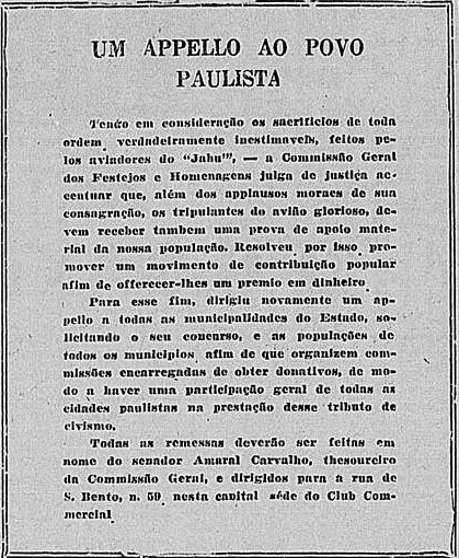 O feito levou ao governo estadual a lançar o seguinte apelo, em maio de 1927: