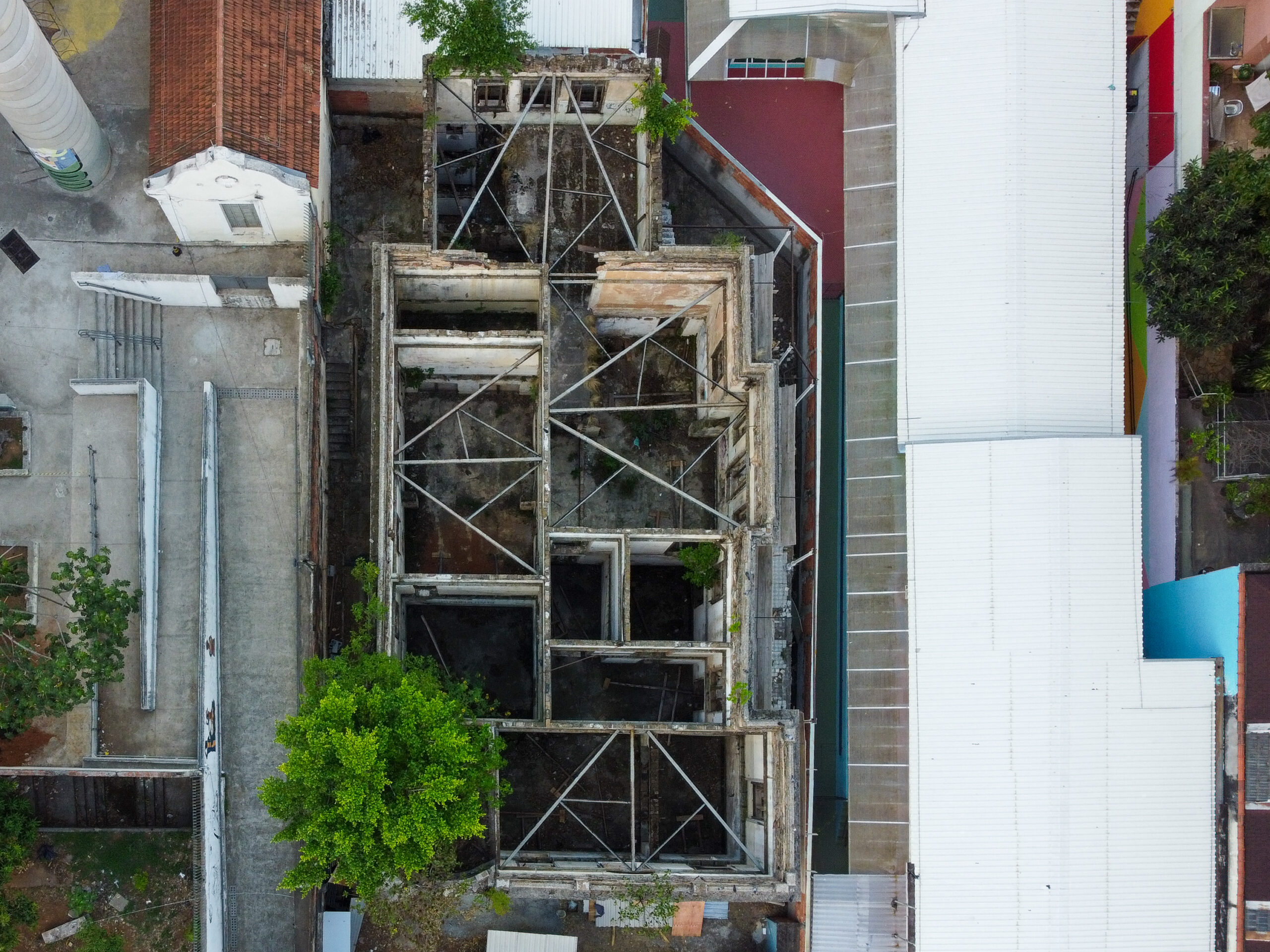 Destelhado, com rachaduras e muitas escoras para que algumas partes da estrutura não desabem, o palacete parece escondido de vergonha pela situação lamentável em que se encontra.