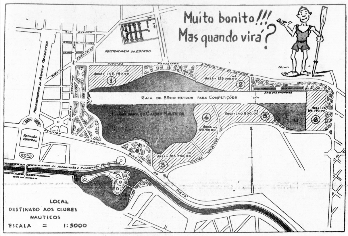 E então foi desenvolvido um projeto que transformava parte da antiga área do curso original do rio Tietê, uma vez retificado, em um enorme parque náutico paulistano, com muito verde, áreas de lazer, e uma grande raia para competições esportivas, com 2500 metros de extensão. Tudo isso em uma área servida por transporte público abundante, como trens, bondes e ônibus.