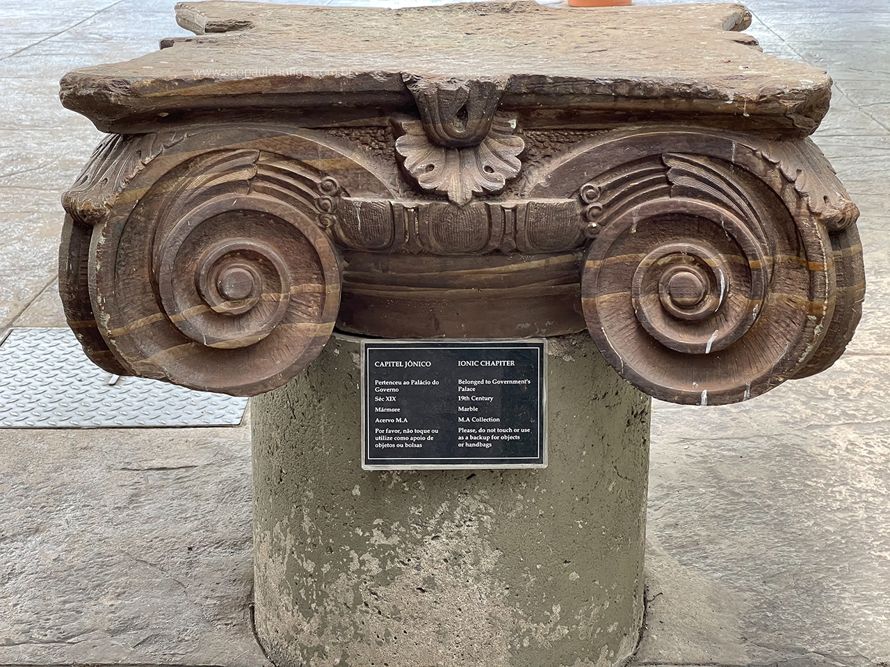 Já um capitel de uma das colunas do mesmo palácio do governo também foi preservado e está nos jardins do pátio do colégio para ser vista pelos visitantes. A foto está ao final deste artigo.