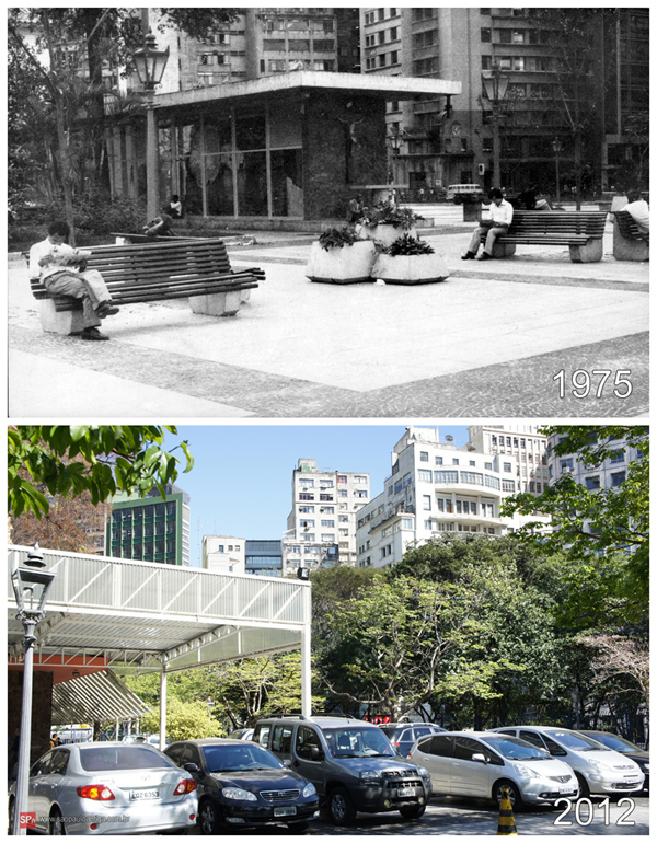 Mas será que São Paulo realmente está progredindo para uma cidade onde carros, bicicletas, transporte coletivo e pedestres possam coexistir com civilidade ? A nossa sessão “Antes & Depois” neste 22 de setembro apresenta duas imagens do Pátio do Colégio em 1975 e 2012, observe: