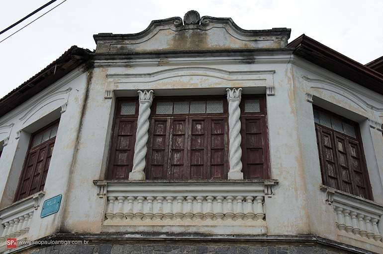 A porção inferior da construção tem um belo acabamento de pedras, infelizmente um pouco vandalizado por pichações. Já a parte superior da fachada do imóvel não possui revestimento especial e conta com um acabamento mais tradicional, com colunas torcidas (salomônicas) e balaustrada.