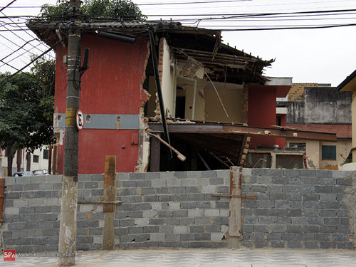 É possível notar que nem mesmo com colunas de ferro bem fortes foi possível resistir. Por outro lado, não notamos a existência de nenhuma placa com alvará autorizando a obra. Será que a subprefeitura local está atenta a esta reforma ?
