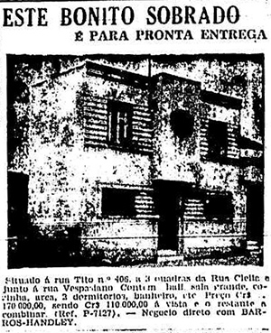 O anúncio ao lado é de 1949 e foi publicado no jornal Folha da Manhã em fevereiro de 1949. Ele aponta para um belo e recém construído sobrado, localizado no número 406 da Rua Tito, na Lapa. O preço a época era de Cr$170.000,00.