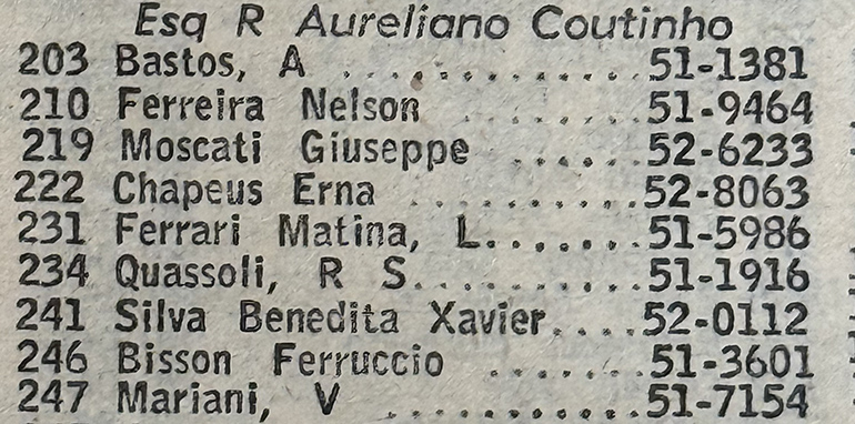 Enquanto isso a residência ao lado, de número 232, não encontrei nenhuma informação sobre os proprietários originais e nem dados telefônicos, não havendo linha na residência nos anos de 1937, 1938, 1961 e 1964. Contudo, encontrei algo curioso. Em 1954 um morador da casa foi detido, acusado de furtar ampolas de morfina de um hospital e revendê-las a viciados.