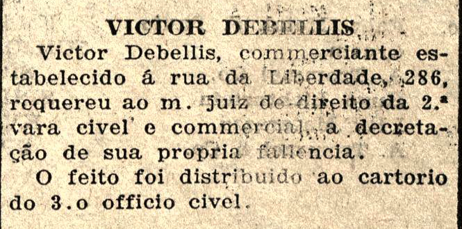 Alguns anos mais tarde ainda na mesma década, precisamente em 1928, surgem nos principais jornais de São Paulo, informes anunciando a falência dos negócios de Victor Debellis, tal qual o apresentado este recorte a seguir: